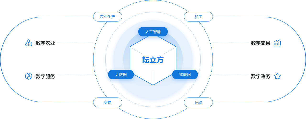 耘立方全产业链服务平台通过利用“人工智能、大数据、物联网”技术,整合农业产业核心要素资源,为地区优势农业产业打造“单品类全产业链服务平台”,包括 数字农业、数字服务、数字交易、数字政务 四大板块,提供覆盖农业生产、加工、运输、交易的全产业链解决方案。